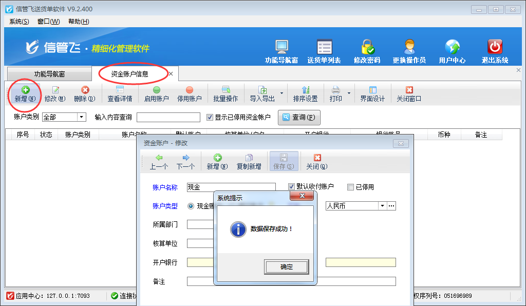 收款結算單用來登記收款信息(收款對象即客戶、收款賬戶、收款金額、經手人等),并結銷應收款記錄。部分用戶在剛開始使用送貨單軟件對軟件功能不熟悉,首次對應收款進行收款結算,錄入收款金額時會提示:默認收付款資金賬戶不存在,請先設定默認收付款資金賬戶!(如下圖所示)無法繼續填開收款結算單。 這種情況是因為在系統內沒有維護收款賬戶導致的,請在功能導航窗點擊“基礎資料”—》“資金賬戶”打開資金賬戶管理界面增加資金賬戶即可,如下圖所示。 資金賬戶新增之后,重新對應收款進行收款結算即可,如何填開收款結