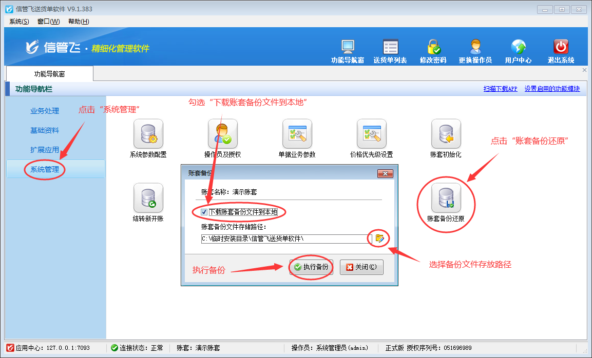 信管飛倉庫管理軟件、信管飛出納記賬軟件、信管飛送貨單軟件、信管飛RMS等軟件賬套數據默認存儲在軟件安裝目錄下,支持對賬套數據進行備份,如需要更換主機電腦,需要在原來的主機電腦上備份賬套數據,將生成的備份文件復制到新的主機電腦上,然后在新的主機電腦上安裝軟件,使用備份文件還原數據即可。 以信管飛送貨單軟件為例,演示一下更換電腦時如何在原來的主機電腦上備份賬套數據? 一、在信管飛送貨單軟件應用中心程序中執行賬套備份。 請在應用中心程序中,點擊“賬套管理”