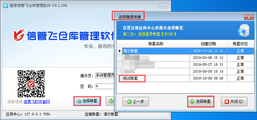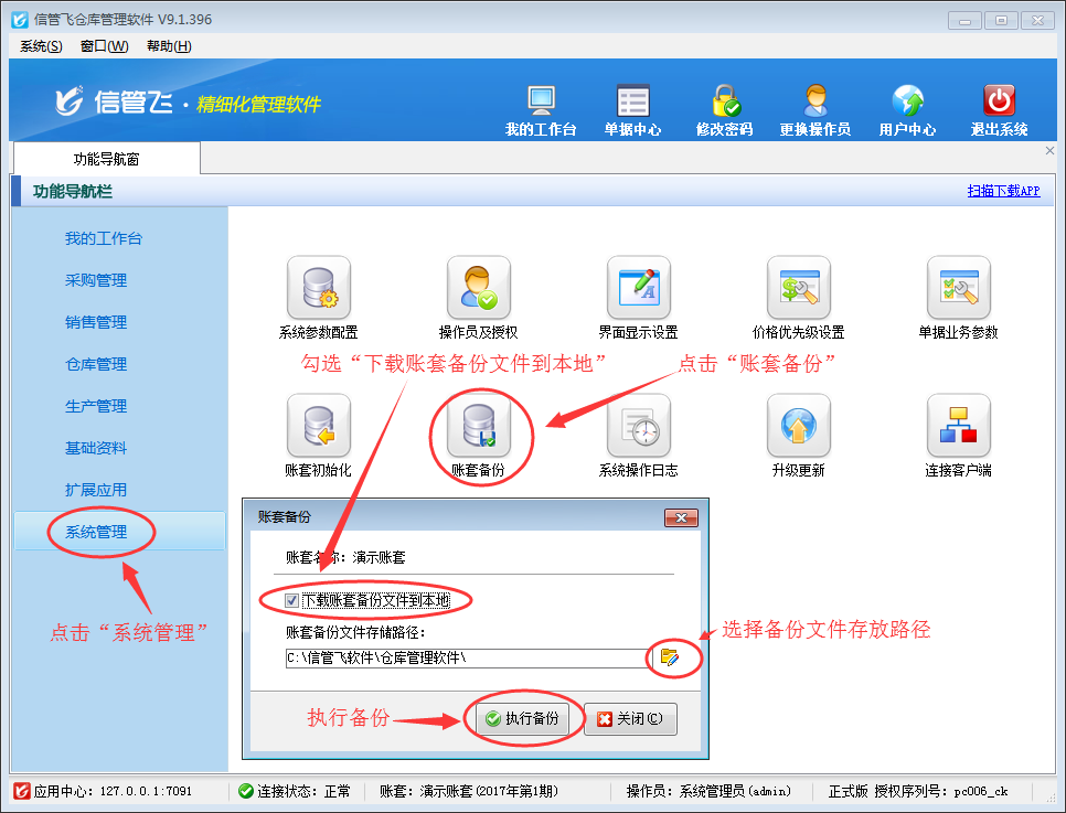 信管飛倉庫管理軟件、信管飛出納記賬軟件、信管飛送貨單軟件、信管飛RMS等軟件賬套數據默認存儲在軟件安裝目錄下,支持對賬套數據進行備份,如需要更換主機電腦,需要在原來的主機電腦上備份賬套數據,將生成的備份文件復制到新的主機電腦上,然后在新的主機電腦上安裝軟件,使用備份文件還原數據即可。 以信管飛倉庫管理軟件為例,演示一下更換電腦時如何在原來的主機電腦上備份賬套數據? 一、在信管飛倉庫管理軟件應用中心程序中執行賬套備份。 請在應用中心程序中,點擊“賬套管