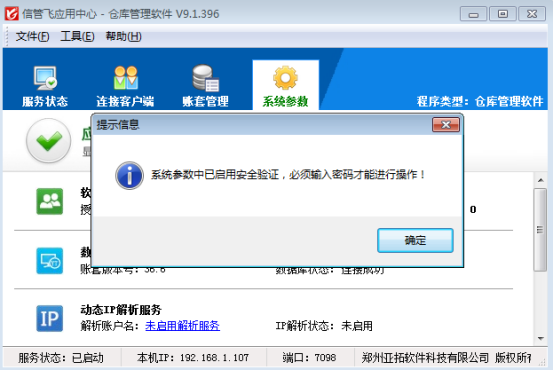 亞拓軟件采用新架構技術開發的信管飛RMS(進銷存軟件)、信管飛送貨單軟件、信管飛出納記賬軟件、信管飛倉庫管理軟件等都包括應用中心及客戶端程序,“應用中心”是系統的管理控制中心,集中管理連接客戶端和賬套數據庫,從而實現數據的集中存儲和實時共享,應用中心主要包括運行狀態管理、連接客戶端管理、賬套管理、系統參數設置以及其他管理功能。 應用中心的管理和配置會對軟件的運行產生重大影響,因此軟件提供增強安全驗證功能,啟用安全驗證后執行賬套管理、系統參數設置等功能時會要求輸入密碼,驗證密碼通過后才可以進行相應操作。下面我們以信管飛倉庫
