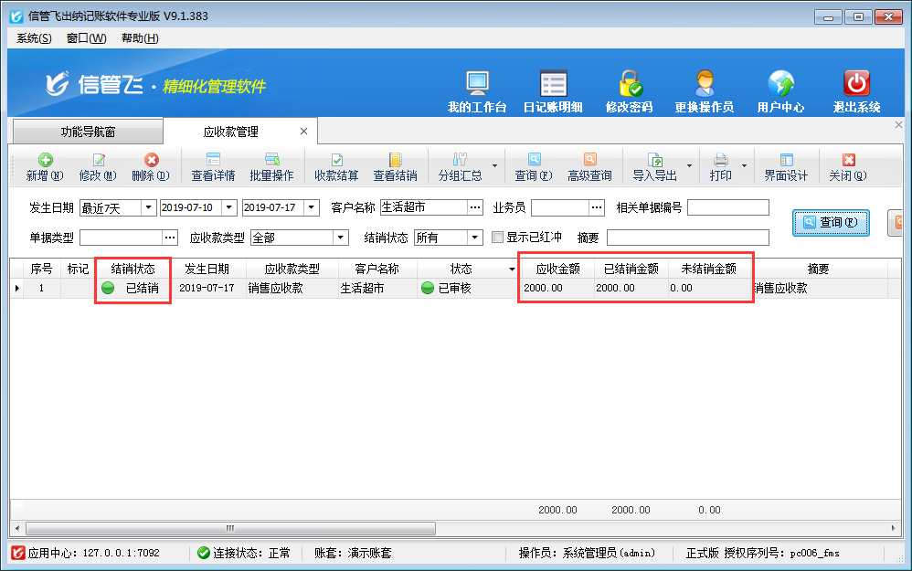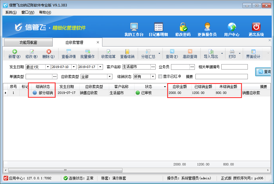 收款結算單用來登記收款信息(收款對象即客戶、收款賬戶、收款金額、經手人等),并結銷應收款記錄。正常情況下,應收金額為多少,即客戶支付我們多少貨款,但是部分情況下,客戶支付給我們貨款時可能因為各種原因只能給我們支付其中一部分,然后過段時間在支付剩余貨款。本篇文章以出納記賬軟件為例演示一下部分收款的情況下如何開收款結算單。 如下圖所示,客戶“生活超市”應收金額為2000元,已結銷金額為0。客戶在給我們支付貨款時只能支付1200元,剩余800元以后在付款。 在應收款管理界面點擊“收款結算”按