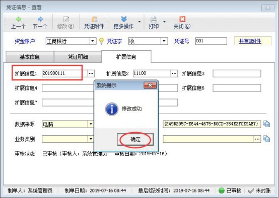 信管飛出納記賬軟件中不可以直接修改已審核憑證的擴展信息,下面我們介紹一下如何啟用可修改已審核憑證的擴展信息功能。 在功能導航窗點擊“系統管理”→“系統參數設置”→“業務參數”可以進入到“業務參數”配置界面,在業務單據相關參數內打勾啟用“可修改已審核憑證的擴展信息”參數,并設置參數值(擴展信息字段名),默認為“ext1,ext2(擴展信息1,擴展信息2)”,如下圖所示:圖1 設置完成之后保存參數設置,在功能導航窗點擊“出納管理”→“銀行日記賬”,打開一個已審核的銀行日記賬憑證,然后點擊擴