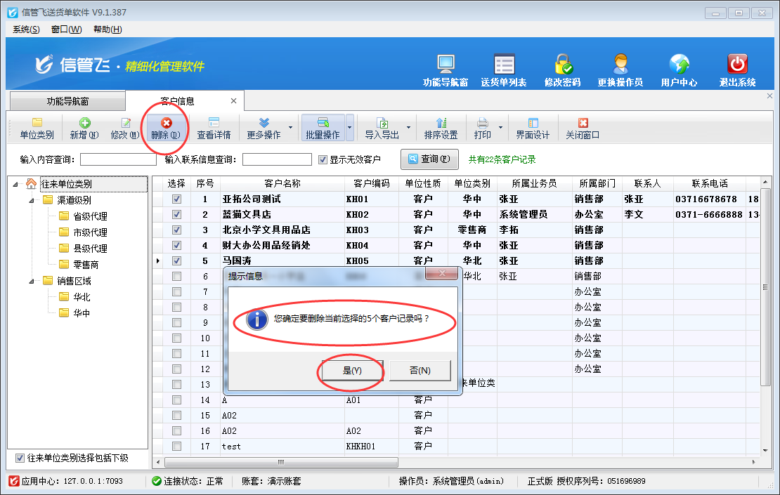 送貨單打印軟件支持維護客戶信息,出現客戶信息大范圍錄入錯誤時,軟件支持對錯誤客戶資料進行批量刪除操作,避免一個一個刪除的麻煩。以信管飛送貨單軟件為例示范下如何操作? 在功能導航窗選擇“基礎資料”—》“客戶信息”進入客戶信息管理界面,選擇工具欄的“批量操作”按鈕,進入批量操作模式,選擇需要刪除的客戶信息(批量操作支持全選、全不選、反選),如下圖所示: 批量選擇客戶信息后,點擊工具欄的“刪除”按鈕,會提示“您確定要刪除當前選擇的客戶記錄嗎?”,點擊“是”進行批量刪除操作。如下圖所示:【注意