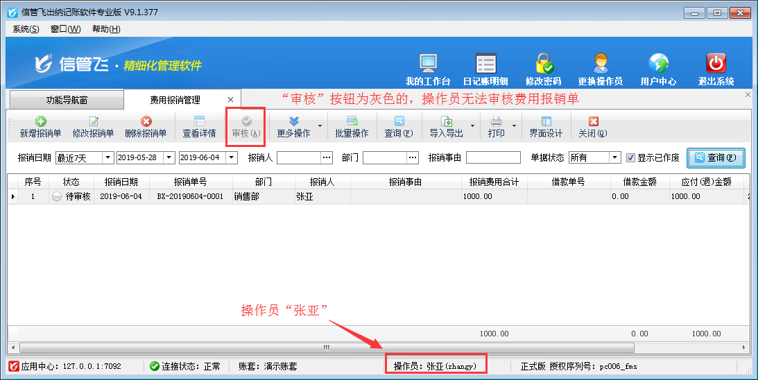 在日常工作中,因?yàn)榕R時(shí)事件的發(fā)生,員工經(jīng)常會(huì)自己墊付工作所需要的各項(xiàng)費(fèi)用。這些費(fèi)用在月末時(shí)可以填寫費(fèi)用報(bào)銷單進(jìn)行統(tǒng)一的報(bào)銷。信管飛出納記賬軟件專業(yè)版有費(fèi)用報(bào)銷管理功能,可以管理費(fèi)用報(bào)銷單,并支持設(shè)置操作員費(fèi)用報(bào)銷單審核權(quán)限,下文我們?cè)敿?xì)介紹一下出納記賬軟件內(nèi)如何設(shè)置操作員不允許審核費(fèi)用報(bào)銷單? 在功能導(dǎo)航窗點(diǎn)擊“系統(tǒng)管理”—》“操作員及授權(quán)”打開操作員管理及授權(quán)界面,選擇操作員“張亞”,在功能模塊權(quán)限界面,選擇“綜合管理”—》“費(fèi)用報(bào)銷管理”,把費(fèi)用報(bào)銷管理“審核”權(quán)限勾選取消后保存權(quán)限,如下圖一所示:圖一 &