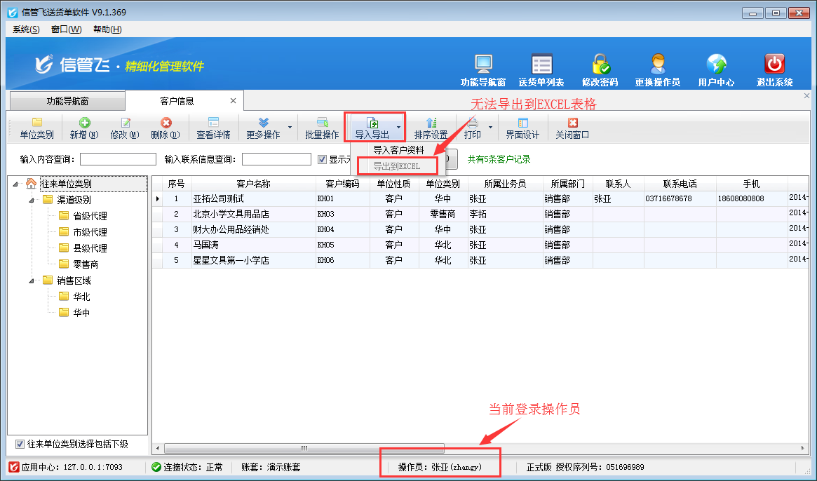 信管飛送貨單軟件、信管飛RMS、信管飛倉庫管理軟件等都支持管理基礎資料信息和允許設置多個操作員進行登錄軟件。軟件支持將基礎資料信息以EXCEL的形式導出放到自定義的文件夾內以供備份或保存,如果需要設置操作員不允許導出客戶信息,如何設置?本文以信管飛送貨單軟件為例,示范下如何設置操作員不可導出客戶信息。 在功能導航窗點擊“系統管理”—》“操作員及授權”打開操作員管理及授權界面,選擇操作員“張亞”,在功能模塊權限界面,選擇“基礎資料”—》“客戶信息”,在導出權限下,把客戶信息“導出”權限勾選取消后保存權限,如下圖1所示:圖1