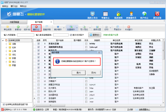 信管飛RMS(進銷存軟件)支持維護客戶信息,出現客戶信息大范圍錄入錯誤時,軟件支持對錯誤客戶資料進行批量刪除操作,避免一個一個刪除的麻煩。以信管飛RMS專業版為例示范下如何操作? 在功能導航窗選擇“基礎資料”—》“客戶信息”進入客戶信息管理界面,選擇工具欄的“批量操作”按鈕,進入批量操作模式,選擇需要刪除的客戶信息(批量操作支持全選、全不選、反選),如下圖所示:圖1 批量選擇客戶信息后,點擊工具欄的“刪除”按鈕,會提示“您確定要刪除當前選擇的客戶記錄嗎?”,點擊“是”進行批量刪除操作。