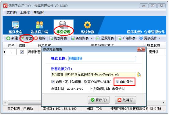信管飛送貨單軟件、信管飛RMS、信管飛出納記賬軟件、信管飛倉庫管理軟件及信管飛票據(jù)軟件都支持設(shè)置賬套自動備份,我們強烈建議啟用自動備份功能,以便賬套出現(xiàn)問題的時候從賬套備份文件中恢復(fù)數(shù)據(jù)。下面我們以信管飛倉庫管理軟件為例詳細介紹一下如何啟用賬套自動備份功能? 首先打開軟件應(yīng)用中心主界面,點擊“系統(tǒng)參數(shù)”—》“賬套備份參數(shù)”,可以打開賬套備份參數(shù)界面,賬套備份參數(shù)內(nèi)可設(shè)置是否啟用自動備份、備份時間間隔和備份目錄,如圖1所示。圖1 勾選“啟用賬套自動備份”即可啟用系統(tǒng)賬套自動備份功能,軟件