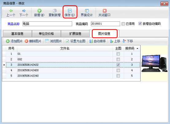 信管飛倉庫管理軟件、信管飛RMS(進銷存軟件)都可以對商品信息進行管理,都支持上傳商品圖片,以便用戶查看商品圖片信息。本篇文章以信管飛倉庫管理軟件為例介紹一下如何上傳商品圖片。 在功能導(dǎo)航窗點“基礎(chǔ)資料”—》“商品信息”即可進入“商品信息”界面,對商品進行新增或修改時可以編輯商品信息、上傳商品圖片信息。以商品“電腦”為例,對商品進行修改,系統(tǒng)彈出“商品信息修改”窗口,點擊“圖片信息”頁面,如圖1所示。圖1 添加圖片:點擊“添加圖片”按鈕,可以選擇已準備好的圖片,支持jpg、png等格式