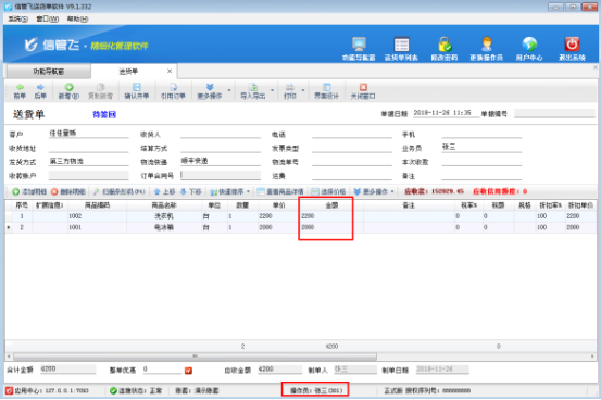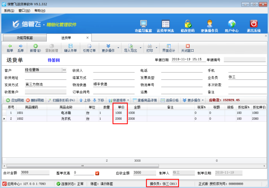 信管飛送貨單軟件、信管飛RMS、信管飛倉(cāng)庫(kù)管理軟件等默認(rèn)開(kāi)單時(shí)金額信息允許修改,為了避免操作員開(kāi)單時(shí)出現(xiàn)金額修改錯(cuò)誤情況,軟件支持設(shè)置操作員不可修改銷(xiāo)售金額的權(quán)限。以“信管飛送貨單軟件”為例,講一下如何設(shè)置操作員不可修改銷(xiāo)售金額。 在功能導(dǎo)航窗選擇“系統(tǒng)管理”—》“操作員及授權(quán)”,進(jìn)入操作員管理及授權(quán)界面,以操作員“張三”為例,選擇操作員后,點(diǎn)擊“其他操作權(quán)限”,取消勾選“可修改銷(xiāo)售金額”,然后保存設(shè)置,如圖1所示。圖1 保存完成后,退出軟件,切換到操作員“張三”登錄軟件,在“業(yè)務(wù)處理