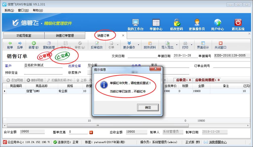 信管飛RMS、信管飛送貨單軟件內(nèi)都支持設(shè)置已發(fā)貨的銷(xiāo)售訂單不可進(jìn)行修改、紅沖操作,本篇文章以信管飛RMS為例詳細(xì)介紹一下如何設(shè)置已發(fā)貨的訂單不可修改不可紅沖? 在功能導(dǎo)航窗點(diǎn)擊“系統(tǒng)管理”→“系統(tǒng)參數(shù)設(shè)置”→“業(yè)務(wù)參數(shù)”可以打開(kāi)“業(yè)務(wù)參數(shù)”配置界面,在業(yè)務(wù)單據(jù)相關(guān)參數(shù)內(nèi)打鉤啟用“已發(fā)貨的訂單不可修改不可紅沖”參數(shù),然后點(diǎn)擊“保存”按鈕保存設(shè)置,如下圖1所示。圖1 系統(tǒng)參數(shù)設(shè)置界面 設(shè)置完成后,點(diǎn)擊“銷(xiāo)售管理”→“銷(xiāo)售訂單”打開(kāi)銷(xiāo)售訂單列表界面,然后打開(kāi)一個(gè)已發(fā)貨完成的訂單反