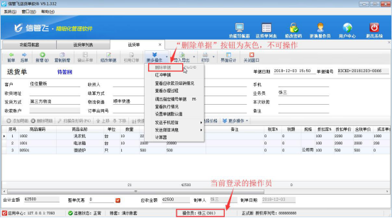 信管飛送貨單軟件中支持刪除單據(jù),送貨單保存后如發(fā)現(xiàn)填寫(xiě)錯(cuò)誤,可以刪除,如圖1所示。圖1 如果需要操作員不可刪除送貨單,軟件也支持設(shè)置操作員不可刪除送貨單權(quán)限,下面以來(lái)演示一下設(shè)置操作員不可刪除送貨單權(quán)限的操作步驟。 登錄軟件,在功能導(dǎo)航窗點(diǎn)擊“系統(tǒng)管理”—》“操作員及授權(quán)”,進(jìn)入“操作員管理及授權(quán)”界面,選擇操作員“張三”,在其右側(cè)的功能模塊權(quán)限內(nèi)選擇“業(yè)務(wù)處理”模塊,將“新開(kāi)送貨單”和“送貨單列表”的“刪除”權(quán)限取消勾選,然后保存設(shè)置,如圖2、圖3所示。圖2圖3
