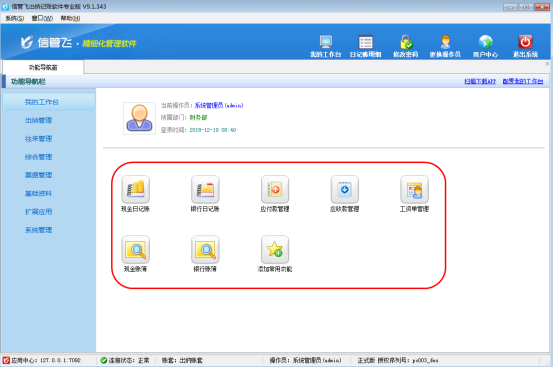 亞拓軟件開(kāi)發(fā)的信管飛出納記賬軟件、信管飛RMS、信管飛倉(cāng)庫(kù)管理軟件、信管飛票據(jù)打印軟件等都包含我的工作臺(tái)功能,我的工作臺(tái)中可以查看當(dāng)前操作員信息,并且可以添加一些常用的功能模塊。下面我們以信管飛出納記賬軟件專(zhuān)業(yè)版為例詳細(xì)介紹下我的工作臺(tái)功能是如何使用的。 首先登錄軟件,點(diǎn)擊“功能導(dǎo)航窗”—》“我的工作臺(tái)”,可以打開(kāi)我的工作臺(tái)界面,如下圖所示:圖1 我的工作臺(tái)界面 在我的工作臺(tái)界面,首先可以查看當(dāng)前操作員信息,另外點(diǎn)擊“添加常用功能”按鈕可以添加當(dāng)前操作員有權(quán)限的常用功能(點(diǎn)擊右上角“配