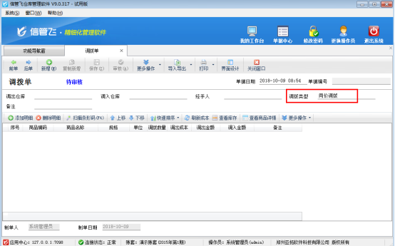 調撥單主要用于庫存商品在各倉庫之間的調貨。調撥分為同價調撥和變價調撥兩種,其中同價調撥方式,商品的成本價以調出倉庫的成本價為準;變價調撥(或稱“異價調撥”),商品的成本價可進行修改,一般用于分攤運費/裝卸費等運輸費用?偛康介T店的調撥一般采用變價調撥。    對于存在多個倉庫的企業來說,對不同倉庫的商品直接進行調撥,是一種很常見的業務。信管飛RMS(進銷存軟件)和信管飛倉庫管理軟件都支持分倉庫管理商品,其中信管飛RMS標準版和專業版、信管飛倉庫管理軟件都支持倉庫調撥功能,可以方便的進行倉庫之間的貨品轉移。