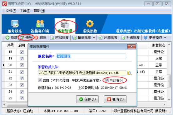信管飛出納記賬軟件、信管飛送貨單軟件、信管飛RMS、信管飛倉(cāng)庫(kù)管理軟件及信管飛票據(jù)軟件都支持設(shè)置賬套自動(dòng)備份,我們強(qiáng)烈建議啟用自動(dòng)備份功能,以便賬套出現(xiàn)問(wèn)題的時(shí)候從賬套備份文件中恢復(fù)數(shù)據(jù)。下面我們以信管飛出納記賬軟件專業(yè)版為例詳細(xì)介紹一下如何啟用賬套自動(dòng)備份功能? 首先打開(kāi)軟件應(yīng)用中心主界面,點(diǎn)擊“系統(tǒng)參數(shù)”—》“賬套備份參數(shù)”,可以打開(kāi)賬套備份參數(shù)界面,賬套備份參數(shù)內(nèi)可設(shè)置是否啟用自動(dòng)備份、備份時(shí)間間隔和備份目錄,如圖1所示: 圖1 勾選