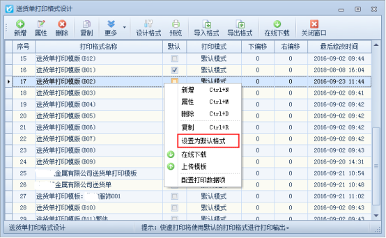 信管飛送貨單軟件、信管飛RMS軟件、信管飛倉(cāng)庫(kù)管理軟件等,在開(kāi)單界面都內(nèi)置了好幾種打印格式,除此之外,軟件也支持自定義設(shè)計(jì)打印模板格式,為了開(kāi)單打印單據(jù)方便,軟件可以把常用的模板設(shè)置為默認(rèn)模板,開(kāi)單保存后直接進(jìn)行打印操作。不需要再次選擇模板進(jìn)行打印。 本文以信管飛送貨單為例,示范下如何設(shè)置常用的打印模板為默認(rèn)模板。首先先到打印模板設(shè)計(jì)界面,在開(kāi)單界面,點(diǎn)擊工具欄中的“打印”按鈕下的“打印格式設(shè)計(jì)”進(jìn)入送貨單打印格式設(shè)計(jì)界面,在此界面進(jìn)行設(shè)置默認(rèn)模板操作。有以下三種操作形式:
