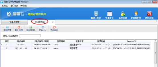 亞拓軟件自主研發的信管飛RMS(進銷存軟件)、信管飛倉庫管理軟件、信管飛送貨單軟件、信管飛出納記賬軟件等軟件都支持多用戶同時登錄使用軟件,數據同步共享。 本文我們以信管飛RMS為例,介紹一下如何查看已登錄軟件的連接客戶端。 第一種方法:打開應用中心程序后,在電腦右下角雙擊打開紅色圖標,系統打開應用中心界面,如圖1所示,點擊“連接客戶端”,可以管理已連接到主機的客戶端電腦信息,包括客戶端IP、客戶端網卡地址、登錄操作員、登錄賬套以及登錄時間。圖1 點“