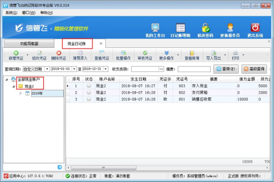 很多剛學出納的學員都需要找一些出納電腦記賬表格、出納記賬表、出納記賬表格模板、出納Excel流水賬表格等出納相關記賬表格,以方便按照表格模塊進行記賬。信管飛出納記賬軟件中包含豐富的記賬統計表格,比如日記賬表格、現金銀行賬簿、資金日(月)報表等等,可以通過軟件中的導出為Excel功能,生成記賬表格或者直接在出納軟件中把記賬記錄打印出表格下面就給大家介紹下如何導出和打印這些記賬表格。 1、導出日記賬表格 出納記賬軟件中可以直接根據資金賬戶新增新增現金日記