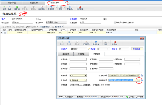 信管飛出納記賬軟件在收/付款結算時支持轉記出納憑證,那么收/付款結算單在轉記出納日記賬憑證之后,如何根據日記賬憑證快速找到相關的收/付款結算單呢?下面演示一下如何根據日記賬憑證快速找到相關的收/付款結算單。 在功能導航窗點擊“出納管理”—》“銀行日記賬”打開銀行日記賬界面,選擇一個日記賬記錄,然后在工具欄點擊“查看憑證”按鈕打開憑證信息查看窗口,在“擴展信息”標簽頁可以查看到日記賬憑證相關的單據(圖一),點擊相關單據號后面的“...”按鈕可以直接打開相應的結算單(圖二)。圖一圖二 相關