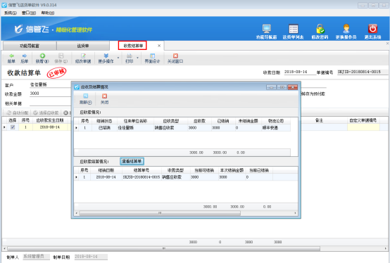 信管飛送貨單軟件開過送貨單后,會自動生成這個送貨單對應的應收款信息,后續收款時可以對應收款進行收款結算。如何快速查看一個送貨單的應收款及結銷情況呢?下面我們演示一下操作步驟。 打開一個送貨單,點擊“更多操作”—》“查看應收款及結銷情況”,系統會彈出“應收及結算情況”窗口,如下圖1、圖2所示:圖1圖2 在“應收及結算情況”窗口,可以看到這個送貨單對應的應收款情況及應收款結算情況。如果需要查看結算單詳情,可以點擊“查看結算單”按鈕,然后系統會自動打開“收款結算單”界面,如圖3所示:圖3&n