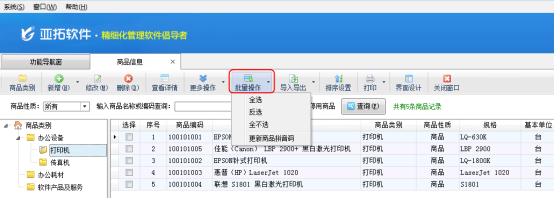 亞拓管理軟件、紅管家倉庫管理軟件和紅管家送貨單軟件都包括對商品信息的管理。商品信息集中管理和維護商品資料,可以對商品信息分類管理。在軟件中如何快速批量修改商品類別呢?下面我們以亞拓管理軟件專業版為例詳細介紹下如何批量修改商品類別。 在功能導航窗中點擊“基礎資料”—》“商品信息”,即可進入“商品信息”界面,如圖1所示。圖1 以圖1為例,商品類別是“商品類別”的一共有3條記錄,現在要把這3條記錄的商品類別改為“打印機”。首先點擊第2行記錄,然后按下Shift鍵不松手時鼠標點擊第4行記錄,這