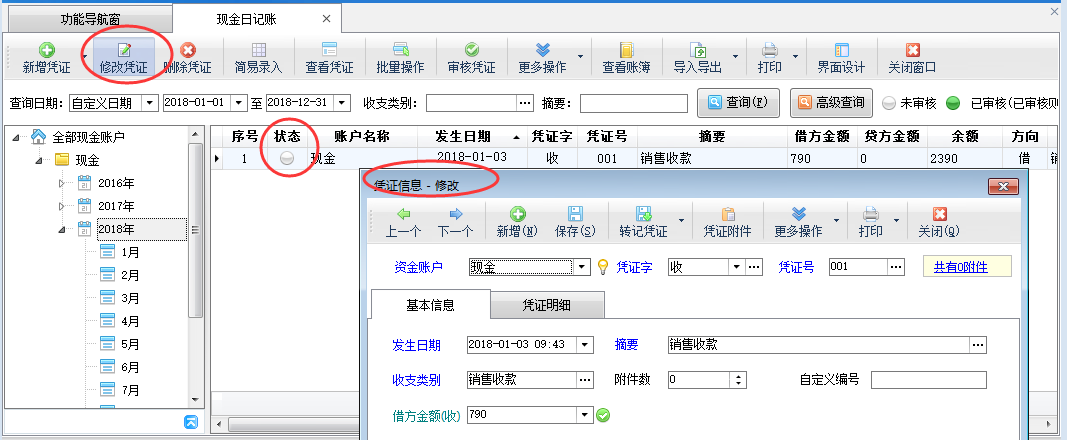 紅管家出納記賬軟件是一款針對各類企事業單位財務出納記賬開發的,集現金日記賬記賬與點驗、銀行日記賬記賬與核帳、應收應付往來賬管理、票據管理(支票管理、承兌匯票管理)、發票管理、工資管理、個人借款管理為一體的出納管理記賬軟件。 紅管家出納記賬軟件中憑證審核后,不允許直接修改(如下圖一所示)。但是部分客戶需要對已審核的憑證進行修改,軟件支持反審修改憑證功能。本篇文章我們介紹一下紅管家出納記賬軟件中如何反審日記賬憑證?圖一 在功能導航窗點擊“現金日記賬”打開現金日記賬界面,選擇一個“已審核”的