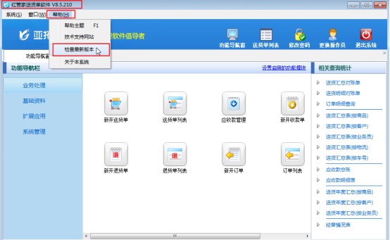 亞拓軟件自主研發的亞拓管理軟件、紅管家倉庫管理軟件、紅管家送貨單軟件、紅管家出納記賬軟件、紅管家票據打印軟件等軟件都是不斷升級更新版本的。亞拓軟件官網會不定期發布最新版,新版本會根據客戶反饋問題和測試問題改進軟件功能并處理程序存在的Bug,從而不斷優化和調整軟件功能、性能。軟件購買后后續版本免費升級,軟件支持聯網檢查最新版本,用戶檢查到最新版后下載安裝最新版本即可。    本文我們以紅管家送貨單軟件為例,截止到本文發布日期,紅管家送貨單軟件最新版是V8.5.217版本,我們以V8.5.210版本為例介紹下軟件聯網檢查最新版的兩