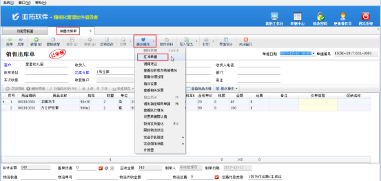 亞拓軟件開發的新架構進銷存軟件——亞拓管理軟件具有紅沖單據的功能,紅沖相當于作廢,有時單據已審核后又發現有錯誤或者不需要此單據了,想刪除此單據時,此時可以將“已審核”的單據進行紅沖,紅沖后的單據會變為無效,相應的應付款、應收款會刪除,之前對庫存的影響也會解除。下面我們以亞拓管理軟件專業版的銷售出庫單為例,介紹一下紅沖單據(作廢單據)的操作方法。1、可以在銷售單列表紅沖作廢銷售出庫單    在功能導航窗點擊“銷售管理”—》“銷售單列表”即可打開“銷售單列表”界面,選中需要作廢的單據,然后點擊“更多操作”—》“紅沖單據(作廢單據)