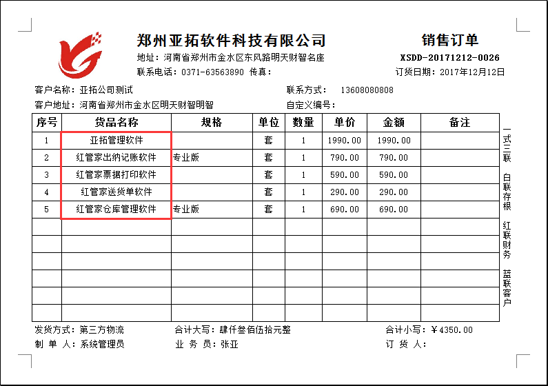 亞拓軟件自主研發的亞拓管理軟件(星光版、標準版、專業版)、紅管家送貨單軟件和紅管家倉庫管理軟件等內置有多種打印格式模版,同時也支持自定義打印格式模版,用戶可以自定義打印樣式,軟件中內置的部分打印格式模版中有些文本框內容默認設置的為居左顯示(如圖一),部分用戶想要設置文本框內容居中顯示,如何設置?圖一  銷售訂單預覽效果圖    以亞拓管理軟件專業版為例,打開一個已開的銷售訂單單據,選擇“打印”按鈕下的“打印格式設計”,進入打印格式設計界面,選擇需要調整的打印格式模版,然后點擊“設計格式”按鈕進入模板設計器界面,如下圖