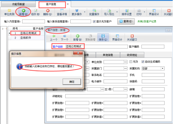 亞拓軟件自主研發(fā)的亞拓管理軟件、紅管家系列的送貨單、出納記賬軟件等支持新增往來單位信息(供應(yīng)商或客戶信息),為了避免增加的往來單位信息出現(xiàn)重復(fù),軟件支持設(shè)置參數(shù)不允許往來單位名稱重復(fù)。 以亞拓管理軟件專業(yè)版為例,在系統(tǒng)管理—》系統(tǒng)參數(shù)配置—》業(yè)務(wù)參數(shù)中的“數(shù)據(jù)可重復(fù)參數(shù)”把“往來單位名稱可重復(fù)”的勾選符號取消,然后保存設(shè)置。如下圖所示: 設(shè)置完成后,打開功能導(dǎo)航窗的“基礎(chǔ)資料”—》“客戶信息”。對一個已經(jīng)增加過的客戶名稱,點擊新增按鈕,輸入
