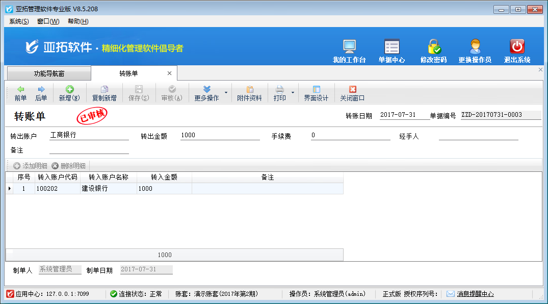 亞拓管理軟件專業(yè)版內(nèi)包含有財務(wù)處理模塊,其中轉(zhuǎn)賬單主要用于實現(xiàn)不同資金賬戶之間的資金劃撥,轉(zhuǎn)賬單不影響總的資產(chǎn)總額(有轉(zhuǎn)賬手續(xù)費的除外),本篇文章我們來介紹一下轉(zhuǎn)賬單的使用方法。 在功能導(dǎo)航窗點擊“財務(wù)處理”—“轉(zhuǎn)賬單”,系統(tǒng)可以打開轉(zhuǎn)賬單界面,如下圖所示。 在單據(jù)主體內(nèi)輸入“轉(zhuǎn)出賬戶”以及“轉(zhuǎn)出金額”,在單據(jù)明細內(nèi)輸入“轉(zhuǎn)入賬戶”以及相應(yīng)的“轉(zhuǎn)入金額”,然后保存并審核單據(jù)即可,其中需要注意的是:“轉(zhuǎn)入金額”加上“手續(xù)費”需等于“轉(zhuǎn)出金額”。 調(diào)閱憑
