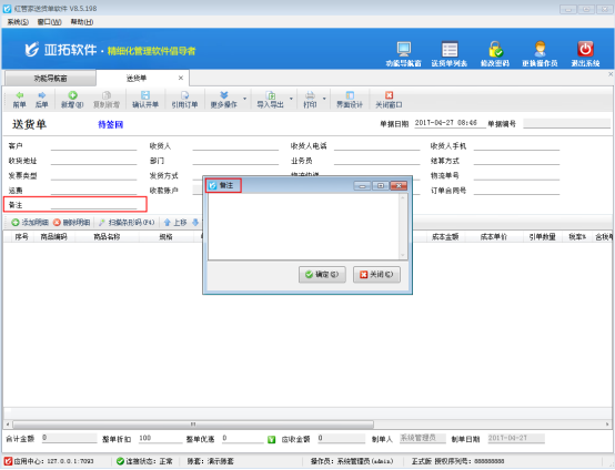 • 送貨單軟件開單錄入備注時如何彈出窗口錄入?