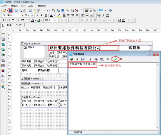 亞拓軟件下的紅管家送貨單軟件、亞拓管理軟件、紅管家倉庫管理軟件等支持打印單據,軟件內置了十幾種打印模板,軟件內置的打印模板的單位名稱是自動調取使用單位名稱,有的客戶需要自定義設計模板中直接固定打印模板中的單位名稱,當需要修改時不清楚怎么操作,我們以送貨單軟件為例,介紹下如何修改固定單位名稱的模板的單位名稱。     打開一個已開的送貨單單據,選擇“打印”按鈕下的“打印格式設計”,進入打印格式設計界面,選擇“設計格式”進入模板設計器界面,如下圖1所示:圖1     打