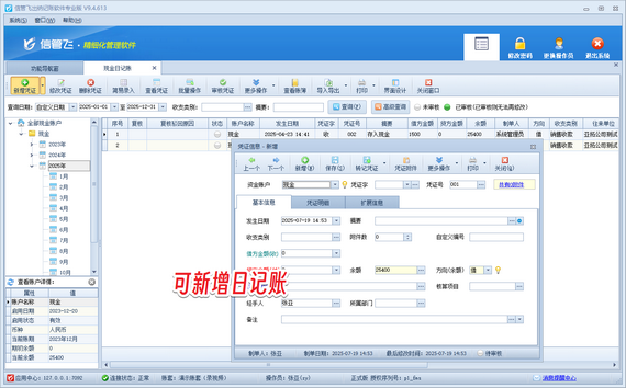 在數(shù)字化財務管理中,精準的權限管理是保障數(shù)據(jù)安全與效率的核心。若操作員賬號登錄信管飛出納記賬軟件后無法新增日記賬憑證,通常源于權限配置未啟用。本篇文章為您呈現(xiàn)高效解決方案。 使用系統(tǒng)管理員賬號登錄軟件,在功能導航窗點擊“系統(tǒng)管理”—》“操作員及授權”打開操作員管理及授權界面,選擇操作員賬號,在其右側(cè)的功能模塊權限內(nèi)選擇“出納管理”,將現(xiàn)金(銀行)日記賬的“新增”權限勾選上,然后保存權限設置,如下圖所示。 權限設置完成后,更換操作員賬號“張亞”重新登錄軟件,即可新增現(xiàn)金(銀行)日記賬,如