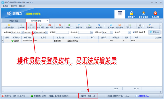 在數(shù)字化財務管理中,權限細分是企業(yè)內(nèi)控的關鍵一環(huán)。信管飛出納記賬軟件以用戶需求為導向,推出“操作員不可登記進銷項發(fā)票”功能,幫助企業(yè)實現(xiàn)財務流程的精準管控。這一設計直擊傳統(tǒng)記賬軟件權限模糊的痛點,讓財務分工更清晰、數(shù)據(jù)更安全。 演示視頻觀看鏈接:出納記賬軟件如何設置操作員不可新增進銷項發(fā)票演示視頻 系統(tǒng)管理員賬號登錄軟件,在功能導航窗點擊“系統(tǒng)管理”—》“操作員及授權”,進入“操作員管理及授權”界面,選擇操作員賬號“張亞”,在其右側(cè)的功能模塊權限內(nèi)選擇“票據(jù)管理”模塊,將進/銷項發(fā)票管