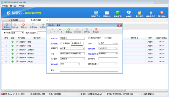 許多用戶在使用軟件記賬時都會問到一個問題:如何新增現(xiàn)金賬戶和銀行賬戶?本節(jié)我們以信管飛RMS專業(yè)版來介紹一下進銷存軟件內(nèi)如何新增資金賬戶? 在功能導航窗點擊“基礎資料”—“資金賬戶”打開資金賬戶信息界面,點擊工具欄中的“新增”按鈕,在彈出的“資金賬戶—新增”窗口錄入賬戶名稱、勾選賬戶類型“現(xiàn)金賬戶”、期初余額及其他相關信息后點擊“保存”按鈕即可保存到系統(tǒng)內(nèi),如下圖 點擊工具欄中的“新增”按鈕,在彈出的“資金賬戶—新增”窗口錄入賬戶名稱、勾選賬戶類型“