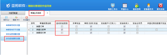 亞拓管理軟件中集成了手機短信發送服務,可以發送開單通知、發貨通知、生日祝福、應收款催款短信等業務短信。軟件中可以設置短信模板,系統會自動調取單據中的內容,無需我們手動輸入繁瑣的內容,可以節約我們寶貴的時間和精力。軟件也支持自定義發送短信。統一采用1065全國全網正規通道,速度更快,更能提升企業形象,軟件只能發送發貨通知等業務短信,嚴禁群發營銷短信。 手機短信管理屬于增值業務,具體開通方式可聯系客服進行咨詢。以亞拓管理軟件專業版為例,來示范如何對短信設置自動發送。