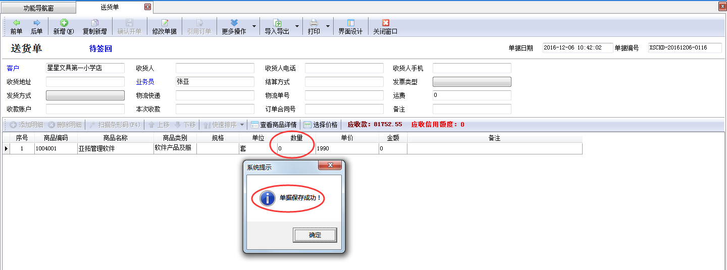 亞拓管理軟件(進銷存管理軟件)、紅管家送貨單軟件(送貨管理軟件)內都可以設置開單時業務單據明細數量允許為0,本篇文章以紅管家送貨單軟件為例詳細介紹在軟件內如何設置業務單據明細數量允許為0? 在功能導航窗點擊“系統管理”——》“系統參數配置”——》“業務參數”可以進入到“業務參數”配置界面,在業務單據明細參數內打勾啟用“業務單據明細數量允許為0”參數,如下圖一所示。圖一 系統參數設置界面 設置完成之后,在功能導航窗點擊“業務處理”——》“新開送貨單”,新增送貨單,