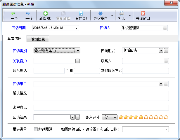 跟蹤回訪用于管理對銷售機(jī)會、合同、客戶服務(wù)單等進(jìn)行跟蹤回訪,回訪包括電話回訪、郵件回訪、短信回訪、上門回訪、QQ/微博/微信回訪等各種形式。支持對未解決的回訪進(jìn)行再次跟蹤回訪。亞拓管理軟件支持在相應(yīng)功能中發(fā)起回訪錄入回訪記錄,也可以在跟蹤回訪管理中錄入回訪記錄。 跟蹤回訪管理為客戶關(guān)系管理模塊(擴(kuò)展模塊),只有在亞拓管理軟件標(biāo)準(zhǔn)版和專業(yè)版內(nèi)才可以使用,本篇文章以亞拓管理軟件專業(yè)版為例詳細(xì)介紹下具體操作步驟。 在功能導(dǎo)航窗,點“客戶關(guān)系”—》“跟蹤回訪管理”,即可進(jìn)入跟蹤回訪界面,如下圖所