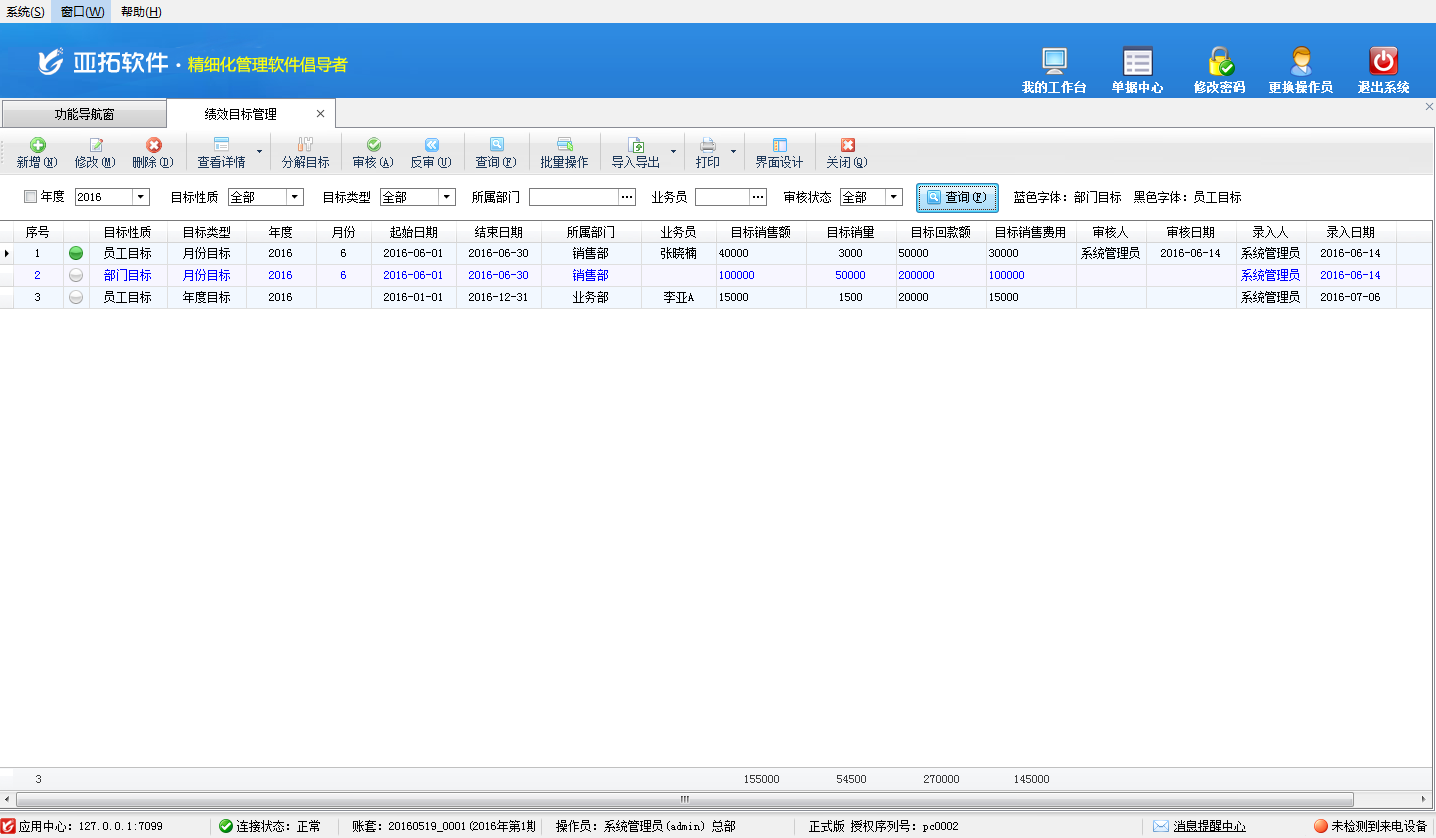 績效目標(biāo)管理模塊屬于擴(kuò)展模塊,只有在亞拓管理軟件標(biāo)準(zhǔn)版和專業(yè)版中才能使用,績效管理通過設(shè)定科學(xué)合理的組織目標(biāo)、部門目標(biāo)和個人目標(biāo),為企業(yè)員工指明了努力方向,促進(jìn)組織和個人績效的提升。 在功能導(dǎo)航窗點擊“擴(kuò)展應(yīng)用”——“績效目標(biāo)管理”,即可進(jìn)入“績效目標(biāo)管理”界面,其界面如下圖所示。 新增績效目標(biāo):在工具欄點擊“新增”按鈕即可新增績效目標(biāo),可以選擇“目標(biāo)性質(zhì)(部門目標(biāo)、員工目標(biāo))”、“目標(biāo)類型(年度目標(biāo)、月份目標(biāo))”及“考核對象(部門、業(yè)務(wù)員)”維護(hù)目標(biāo)銷售額、目標(biāo)銷量、目標(biāo)回款額、目標(biāo)