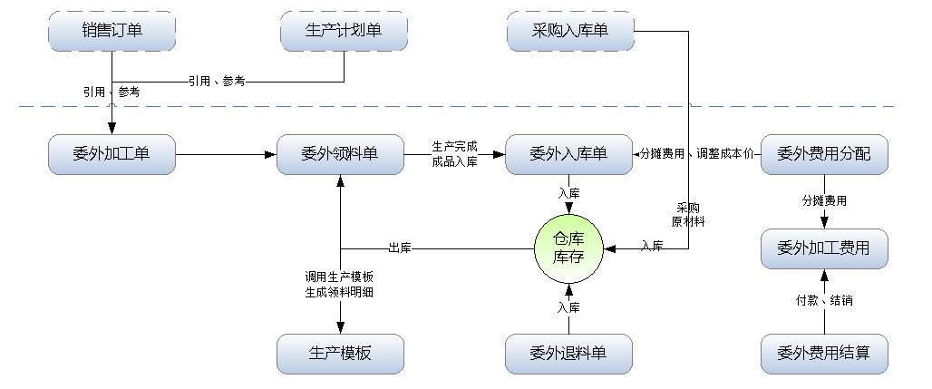 實際的企業生產業務中經常會涉及委外代加工業務,有時候需要委托外部工廠幫我們生產一些配件,有時候需要幫忙生成半成品,然后委外生產的成品或半成品,再進入我們車間進行再加工(如包裝封箱、或二次加工等)。專業版及以上版本可以購買 “委外加工管理”擴展功能模塊來管理此業務。 在功能導航窗,點擊“生產管理”—》“委外加工”,即可進入委外加工管理界面,如下圖所示。 對委外加工需要我們提供原材料(即我們采購的原材料),需代加工廠生產時,我們出庫運送給代工廠(也有可能采購的原材料直接存放在代加工廠倉庫