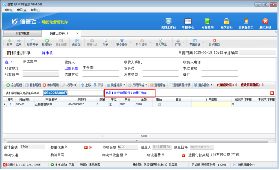 信管飛RMS軟件開單支持選擇輸入、直接輸入和掃描條形碼等方式輸入商品。按條形碼輸入商品(條形碼需提前在商品信息中添加好)時,掃描后提示檢索不到商品,如下圖所示,這種如何解決? 解決此問題需要設置下商品條碼格式匹配,在功能導航窗點擊“系統管理”,打開“系統參數配置”界面,在系統參數中商品條碼格式選擇“商品條形碼”,保存參數配置,如下圖所示: 參數設置完成后,在開單界面再次按條形碼錄入會自動檢索到商品信息,如下圖所示: