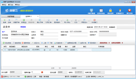 信管飛軟件支持在開單界面設置擴展數值來計算公式的使用,比如有些商品需要件數整箱數量單價來計算金額。為了使客戶對于金額不同計算場景,軟件更提供了自定義計算公式的功能。本文將以送貨單軟件為例,詳細介紹如何根據件數計算金額公式。 在界面設計窗口中,用戶需找到默認列名件數、數量、單價,并設置“金額”的計算公式為三者的乘積。由于系統默認金額計算公式為單價乘以數量,需額外配置金額計算公式:{件數} *{數量}* {單價},如圖。 配置完成后,開單驗證計算公式的準確性。
