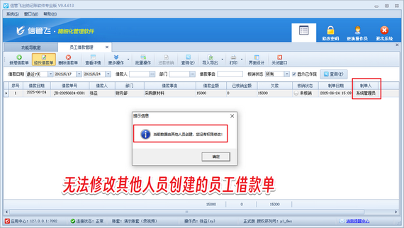 在財務管理的日常工作中,員工借款單的權限管控是確保數據安全與責任明確的關鍵環節。信管飛出納記賬軟件通過靈活的權限配置功能,可實現操作員僅能編輯本人創建的借款單,而無法修改他人單據。本文將詳細介紹如何通過軟件設置,實現操作員無法修改他人創建的員工借款單,保障財務數據的完整性與合規性。 演示視頻觀看鏈接:出納記賬軟件如何設置操作員不可修改他人創建的員工借款單演示視頻 使用系統管理員賬號登錄軟件,在功能導航窗點擊“系統管理”—》“操作員及授權”打開操作員管理及授權界面,選擇操作員賬號,在“數