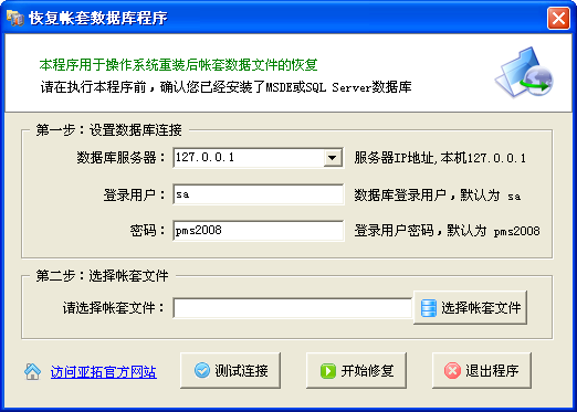 本程序可以在您重新安裝操作系統后,恢復帳套數據庫,支持新陽天進銷存系統、好好用財務出納記賬系統、好好用日記賬系統等全系列系統。如果您的機器無法啟動,有沒有備份的帳套數據文件(后綴名為.pmd)或者很久沒有備份過,可以通過本工具將帳套數據文件(后綴名為.mdf)直接恢復。此程序為最新版本 2001.05.26下載地址: http://www.8090sports.com/download/DBTools.exe程序界面: