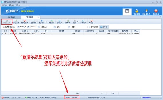 信管飛出納記賬軟件能夠有效實現企業員工借款與還款的流程化登記管理,顯著提升企業管理效率。在實際操作中,有時需要限制某些操作員新增還款單,以保證數據的準確性和安全性。本篇文章介紹一下出納記賬軟件如何設置操作員不可新增還款單? 演示視頻觀看鏈接:出納記賬軟件如何設置操作員不可新增還款單演示視頻 首先使用系統管理員賬號登錄軟件,在功能導航窗點擊“系統管理”—》“操作員及授權”打開操作員管理及授權界面,選擇操作員賬號“張亞”,在右側的功能模塊權限內,選擇綜合管理模塊,將還款單管理的“新增”權限
