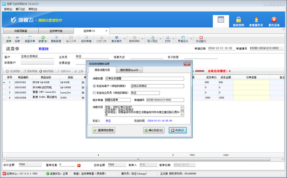 微信消息服務是信管飛軟件基于微信開放平臺研發的業務消息發送服務,支持即時推送業務單據消息,如訂單通知、發貨信息等。支持客戶查看消息詳情(可配置外部查看數據項)、單據簽收確認、分享轉發等功能。有用戶在填開單據后發送微信模板消息時,無法發送成功, 系統彈出提示信息“您沒有發送微信消息的權限,請與系統管理員聯系!”,如下圖所示。 演示視頻觀看鏈接:您沒有發送微信消息的權限,如何解決演示視頻 出現以上問題的原因是:當前登錄的操作員賬號沒有可發送微信消息的權限。