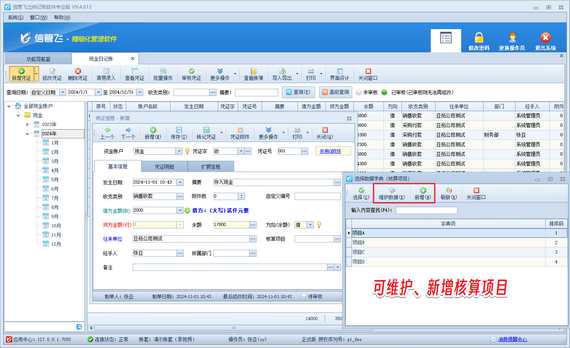 信管飛出納記賬軟件支持在日記賬憑證界面輸入核算項(xiàng)目,也支持按核算項(xiàng)目統(tǒng)計(jì),方便用戶統(tǒng)計(jì)不同項(xiàng)目的日記賬信息。有用戶在登記出納憑證時(shí),只能從已維護(hù)好的核算項(xiàng)目內(nèi)容進(jìn)行選擇,而不能維護(hù)、新增核算項(xiàng)目內(nèi)容,如下圖所示。 演示視頻觀看鏈接:操作員無法維護(hù)出納憑證的核算項(xiàng)目,如何解決演示視頻 出現(xiàn)以上問題的原因是:登錄的操作員賬號(hào)沒有可維護(hù)出納憑證核算項(xiàng)目的權(quán)限。 解決方法如下:使用系統(tǒng)管理員賬號(hào)登錄軟件,在功能導(dǎo)航窗點(diǎn)擊“系統(tǒng)管理”—》“操作員及授權(quán)”打開操