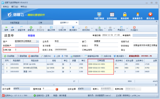 信管飛RMS、信管飛倉庫管理軟件、信管飛送貨單軟件等都支持開銷售出庫單來管理銷售送貨。部分用戶存在客戶先下訂單然后根據(jù)銷售訂單進(jìn)行發(fā)貨。為了避免重復(fù)發(fā)貨,軟件可設(shè)置銷售出庫單引單生成,顯示引單次數(shù),造成多次發(fā)貨。 本文以“信管飛送貨單軟件”為例,介紹送貨單引用訂單,如何顯示引單次數(shù)? 在功能導(dǎo)航窗選擇“系統(tǒng)管理”—》“系統(tǒng)參數(shù)配置”,在業(yè)務(wù)參數(shù)的“特殊功能參數(shù)”中勾選啟用參數(shù)“送貨單引用訂單(引單次數(shù))”,參數(shù)值默認(rèn)擴(kuò)展數(shù)值extnum2(可修改其他擴(kuò)展數(shù)值),保存參數(shù)配置,如下圖所示: