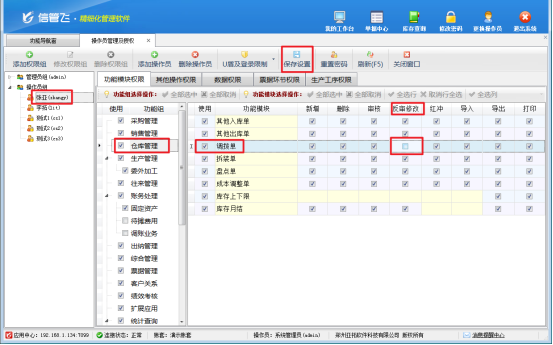 對(duì)于擁有多個(gè)倉庫的企業(yè)而言,實(shí)現(xiàn)不同倉庫間商品的直接調(diào)撥是一項(xiàng)常規(guī)業(yè)務(wù)。信管飛軟件標(biāo)準(zhǔn)版與專業(yè)版及倉庫管理軟件都支持分倉庫管理商品,并且內(nèi)置了倉庫調(diào)撥功能,極大地便利了倉庫間的貨品流轉(zhuǎn)。在實(shí)際應(yīng)用中,部分客戶可能僅需查看調(diào)撥單而無需修改,對(duì)此,軟件提供了靈活的操作員權(quán)限設(shè)置功能。本篇文章以“信管飛RMS軟件”為例介紹下如何操作? 首先系統(tǒng)管理員賬號(hào)登錄軟件,在功能導(dǎo)航窗點(diǎn)擊“系統(tǒng)管理”—》“操作員及授權(quán)”,進(jìn)入“操作員管理及授權(quán)”界面,選擇操作員“張亞”,在功能模塊權(quán)限內(nèi)選擇“倉庫管理”模塊,將調(diào)