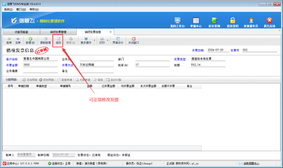 進項發票和銷項發票是對一般納稅人來說的,一般納稅人購進貨物收取的發票稱為進項發票,一般納稅人銷售貨物開出的發票稱為銷項發票。企業在開采購入庫單和銷售出庫單時都存在開發票的情況,信管飛RMS發票管理功能可以讓企業高效快速地管理發票信息。發票管理功能支持對銷項發票的領購登記、使用(填開、作廢)等整個流程的管理,并能夠全面記錄銷項增值稅專用發票、銷項普通發票以及各種進項發票的開具信息。 發票管理模塊是屬于擴展模塊,只有在信管飛RMS標準版和專業版中才能使用。有用戶在使用發票管理模塊過程中,無法修改進/銷項發票,如下圖所示。&n